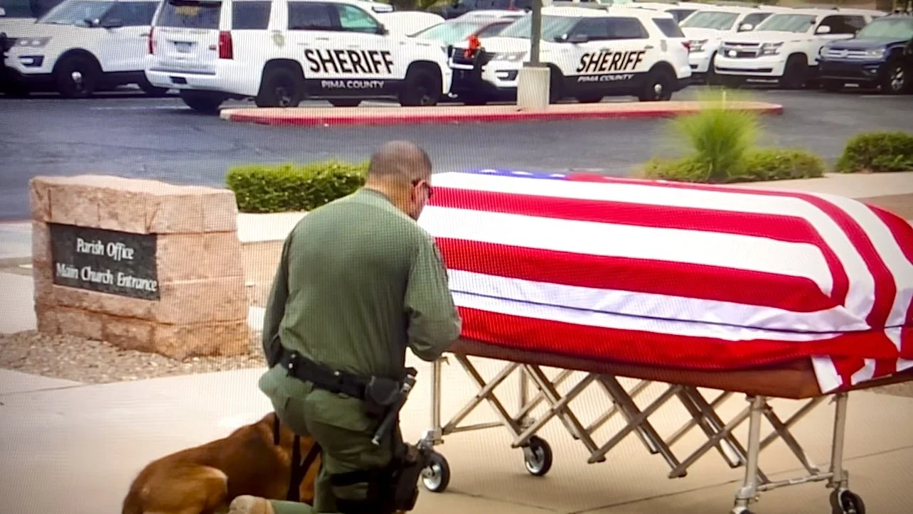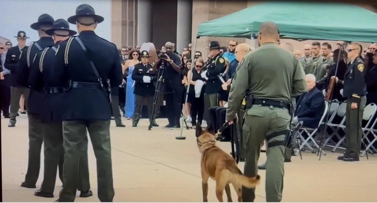 WALKING K9 RYDER UP TO HIS HANDLER'S CASKET